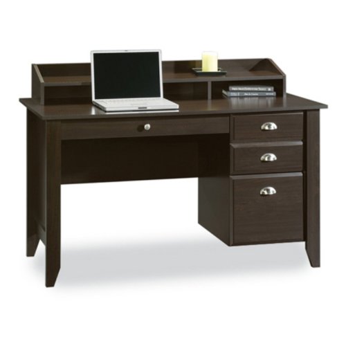 Description : The Sauder Shoal Creek Writing / Laptop Desk with Hutch exemplifies succinct traditional style and attracts admirers with a rich espresso finish and nickel-plated hardware. Laminate over engineered wood (MDF) construction is more than capable of any task you have to send its way. Two storage drawers, one full-length shelf, three cubbyholes, and one letter-size hanging file drawer appease the space conscious. A wire management grommet reduces work surface clutter.About SauderSauder is North America's leading producer of ready-to-assemble (RTA) furniture and the nation's fifth largest residential furniture manufacturer. Based in Archbold, Ohio, Sauder also sources furniture from a network of quality global partners, including a line of office...