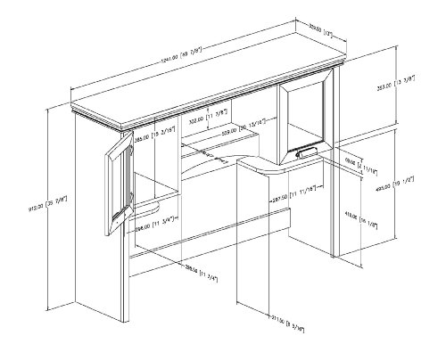 - 1 shelf with rounded molding between the 2 doors matching the decorative kick plate on the desk and bookshelf