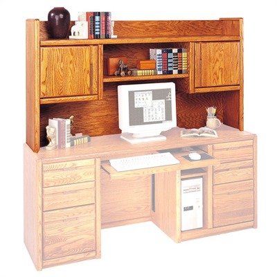 Description : The Kathy Ireland Contemporary home computer desk hutch has been crafted to softly blend with your existing decor. With solid wood construction and oak veneers in a rich, glossy medium finish, the Contemporary collection student desk hutch features smooth edge beveling for added comfort and safety. This compact top desk hutch is perfect for the home or office. Shipping assembled, the Kathy Ireland Contemporary collection saves you from spending your valuable time putting it together, because we know your time is important. Features: Constructed from hardwood solids and veneers Medium oak finish Two solid wood doors One adjustable shelf in center Three dividers behind left door Wire management slot Back of hutch is unfinished Fits on 68" W...