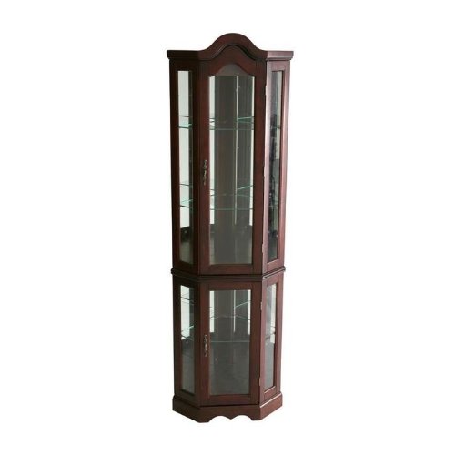 Description : Display your collectables with pride in this lighted display cabinet. Mirrors are present on both back edges to enhance the lighting of your items and give more visual depth. The rich mahogany finish complements the simple straightforward design with tall vertical panes and decorative arch top. Two adjustable shelves are present in the upper cabinet that can be raised, lowered, or removed to suite your needs. Additionally, the lower cabinet also contains one adjustable shelf. This lighted corner display is sure to become a cherished piece of furniture in your home.