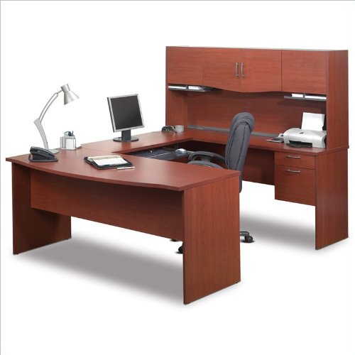 Description : Surround yourself with a perfectly utilitarian workspace thanks to the Bestar Harmony U-Shaped Workstation. This handsome desk set has seemingly endless space including a typing shelf that glides out on smooth ball bearings. The keyboard shelf can be installed under the credenza or bridge. The kit is reversible so you can set it up to fit your own office orientation. One utility drawer sits above a deep file drawer with letter/legal filing system and they both lock with a single key. Cabinets keep you organized and a rubber strip manages wiring. Hanging document shelves keep current projects at hand but out of the way. The smooth surface is a sturdy one-inch thick for strength with a hard commercial-grade melamine veneer that resists scratc...